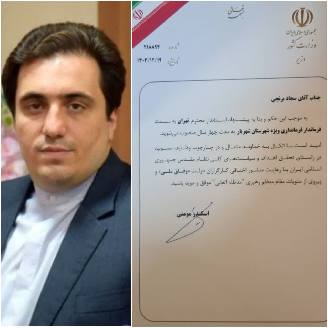 به گزارش پایگاه خبری تحلیلی «مشق نیوز»، بنا بر پیشنهاد محمدصادق معتمدیان استاندار تهران، حکم انتصاب «سجاد برنجی» به عنوان فرماندار فرمانداری ویژه شهرستان شهریار توسط اسکندر مومنی وزیر کشور برای مدت چهار سال صادر شد.